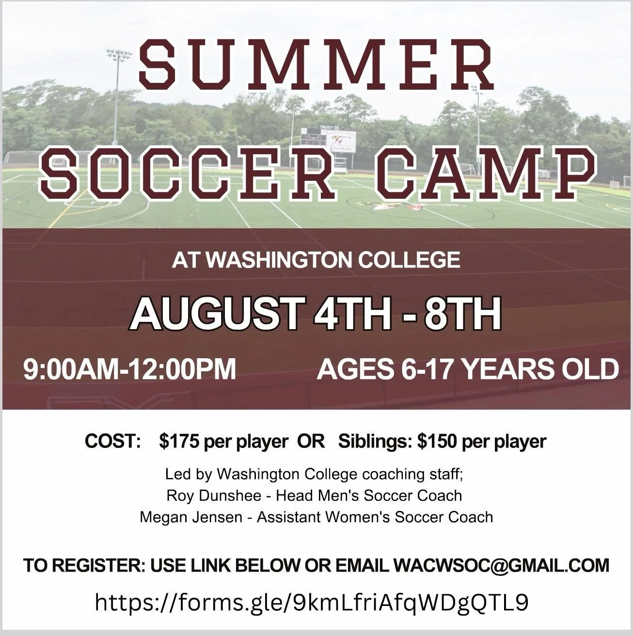 Another amazing summer opportunity for soccer athletes wanting next level training! The Washington College men's and women's soccer programs are hosting a Summer Soccer Camp for ages 6-14 years old. Training sessions are on Kibler Field and led by Washington College coaching staff - Roy Dunshee, men's soccer head coach, and Megan Jensen, women's soccer assistance coach.